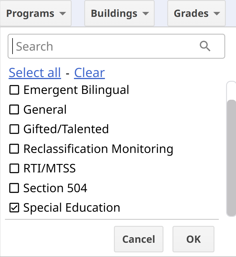 We previously already had a Programs filter on the Students / create new page that allowed users to search for students based on which special programs they were enrolled in. Now we also have a Programs filter on document list pages that allows users to search for documents based on which special program they are associated with.