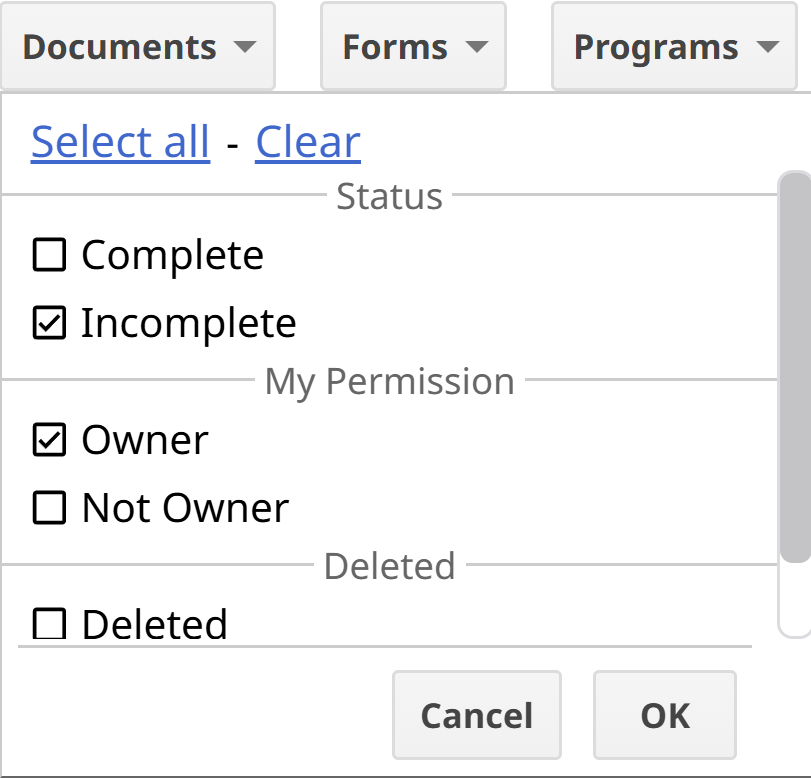 The new Documents filter is now selectable, meaning users can search for documents with various combinations of characteristics. For example, users can search for incomplete documents that they own.
