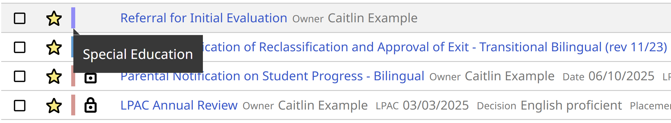 Additionally, each document listed on a page now includes a color coded icon that indicates which special program the document is associated with. This will help users find what they are looking for faster, especially if they are looking at documents for a student who is participating in more than one program.