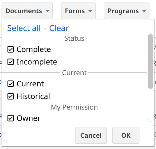 We also added a new filter option within the Documents filter. You can now filter by Current or Historical documents. Both options are selected by default, but you can narrow down the results depending on what you need to find.